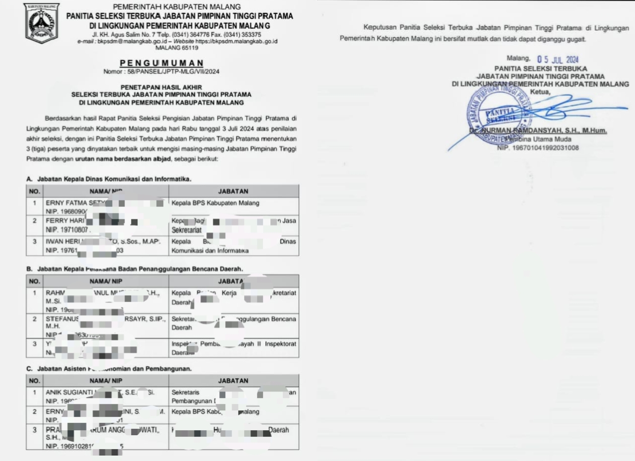 Kabupaten Malang, Beritahumas.com —Sudah lebih dari setahun berlalu sejak Pemerintah Kabupaten Malang menyelesaikan seleksi Jabatan Pimpinan Tinggi Pratama (JPTP). Melalui Pengumuman Nomor: 58/PANSEL/JPTP-MLG/VII/2024 tertanggal 3 Juli 2024, panitia seleksi menetapkan tiga nama terbaik untuk setiap jabatan strategis hasil uji kualifikasi dan asessmen panjang. Namun, hingga memasuki penghujung 2025, hasil itu masih sebatas arsip — tak kunjung diwujudkan dalam bentuk pelantikan.